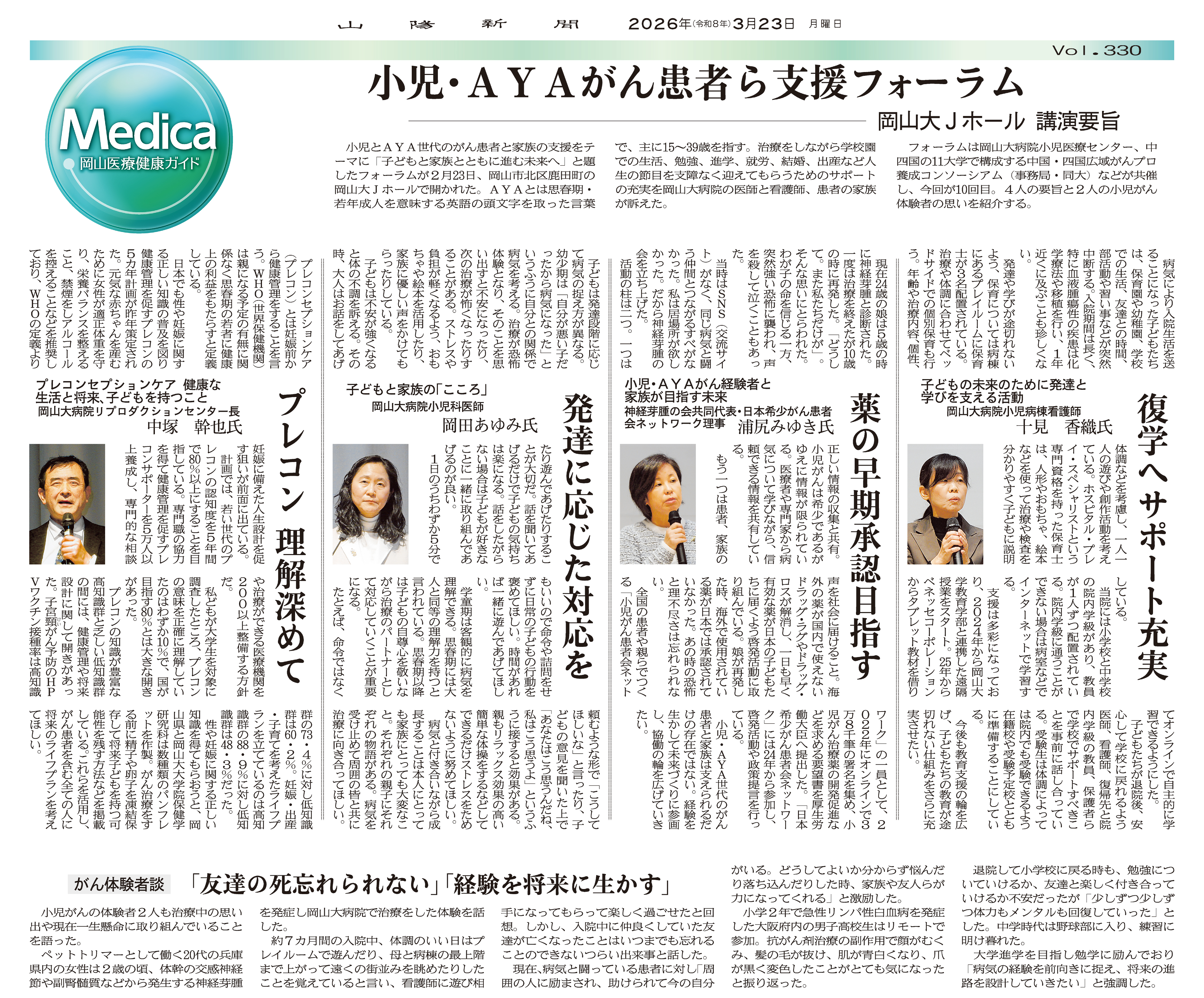 2026년 2월 23일(월·축)에 개최된 “제10회 소아·AYA암 포럼 in 슬롯 머신 apk야마”에 대해서, 강연 내용의 요지를 정리한 기사가, 2026년 3월 23일자의 산요 신문에 게재되었습니다.본 포럼은, 소아·AYA(사춘기·젊음 성인) 세대의 암 환자나 가족, 의료·지원 관계자, 시민의 여러분이 모여, 치료 체험이나 퇴원 후의 생활, 마음의 케어, 장래를 향한 지원의 방법에 대해 생각하는 시민 공개 강좌로서 개최되었습니다.당일은 환자·경험자에 의한 체험담에 가세해 의사나 간호사에 의한 강연이 행해져, 소아·AYA암 환자와 가족을 지지하는 다직종 제휴의 중요성에 대해 이해를 깊게 할 기회가 되었습니다.게재 기사에서는, 당일의 강연 내용의 포인트를 알기 쉽게 소개되고 있습니다. 꼭, 하기 지면과 함께 봐 주세요.
